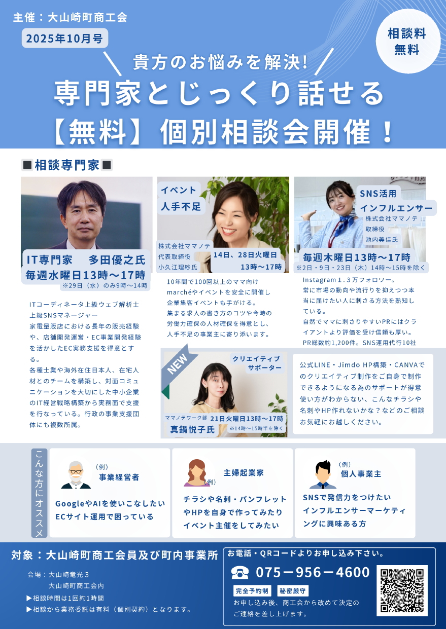 地域の中小企業や個人事業主の方々のお悩みに寄り添い、イベント販路開拓・SNSやITや生成AIの活用・人材の定着など、丁寧な供走支援を行ってまいります。現場のリアルな声や課題に日々触れることで、ママノテとしても「課題の本質を見抜き、解決につなげる力」をさらに磨き、自社のサービスにも活かしてまいります。